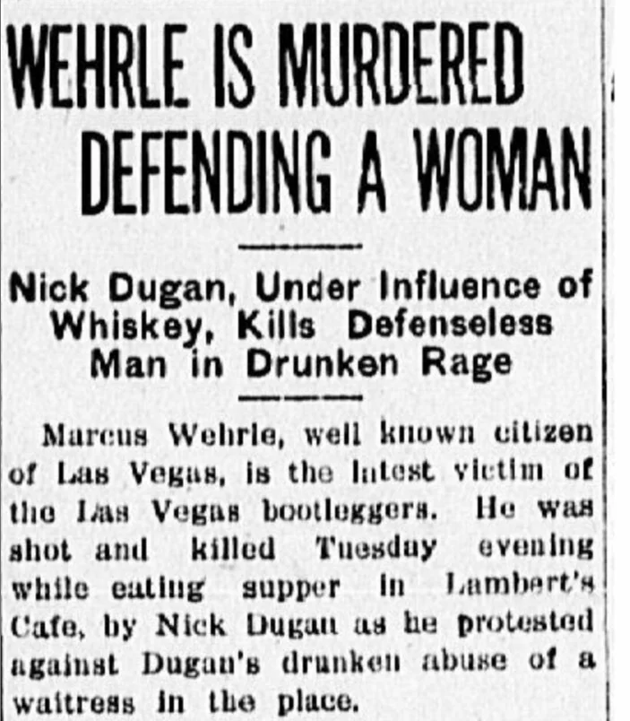Naturally, when alcohol was involved with a murder, the local newspaper highlighted the role drunkenness had played in the violent affair.It came out that Dugan, who by all accounts had a sterling reputation and was traveling to Las Vegas on business, had dropped by Block 16 earlier that day.While touring the dive bars where liquor and beer still flowed despite Prohibition, Dugan had fourteen shots of moonshine over a few hour period.Around five or six that afternoon, he stumbled over to Fremont Street and wandered into Lambert’s Café where his life and the life of Marcus Wherle were forever changed.