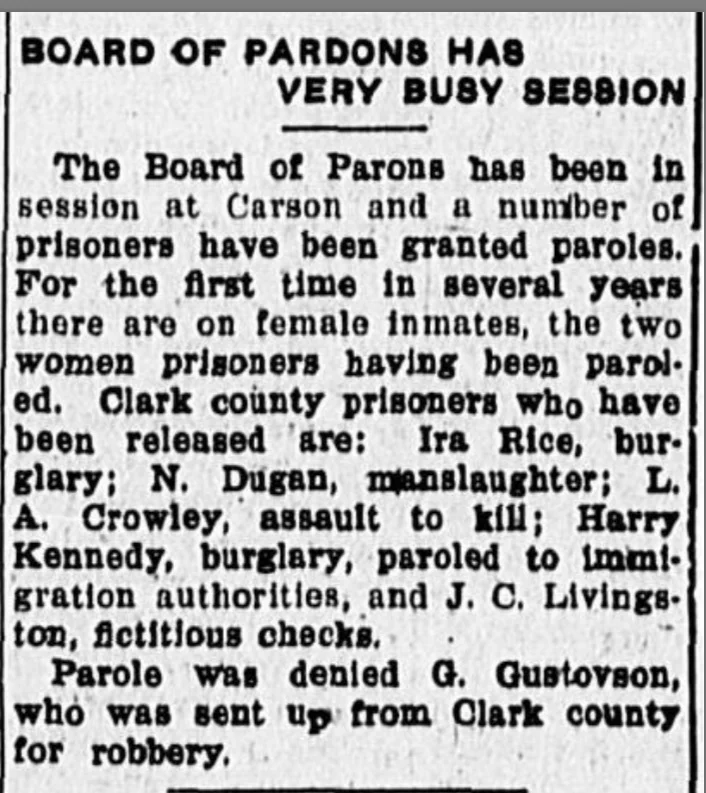 Dugan only served about three years in the Nevada State Prison before being released on parole. The Las Vegas Age continued to rail against the evils of alcohol. And Las Vegas residents continued to have easy and ready access to alcohol for the remainder of Prohibition and beyond.